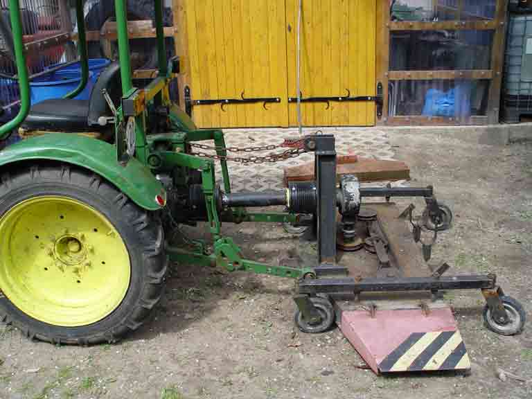Oft hört man das der UT 082 Frontzapfwelle haben soll! Das ist so nicht vorgesehen. Der Irrtum beruht auf dem Bild zu sehenden Zusatzgetriebe mit Gelenkwelle die nach vorne (bis in den Zwischenachsbereich) gerichtet ist. Hier handelt es sich um den Antrieb für das Zwischenachsmähwerk der beim Abbauen des Mähbalkens nicht mit entfernt wurde. Das Getriebe wird auf das Zapfwellengetriebe aufgeschraubt und kann separat geschaltet werden (d.h. wahlweise normaler Zapfwellenbetrieb oder zuschalten des Zwischenachsmähwerkes). Das Zuschalten erfolgt über einen Zugschalter (auf dem Bild kleiner hervorstehender Hebel unter der Kette). |